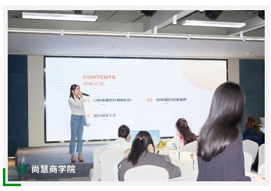 紧接着,陈列部的邹主管为家人们带来了有关服装面料的知识的专业课程,邹主管从纤维、棉、麻、丝、雪纺等的优缺点开始,一一讲述了各种面料的洗涤方法以及注意事项。在面料技法分类中,邹主管细致地讲解了各种面料技法的特点。系统性的学习为的是更好地服务客人,在每一次的服务中展现专业知识,让客人感受舒适的购物体验。